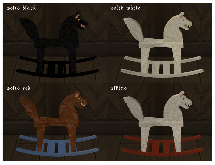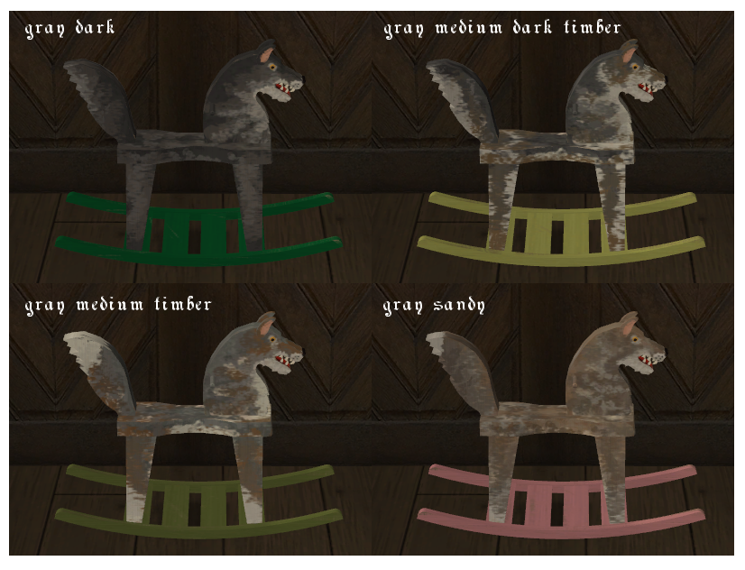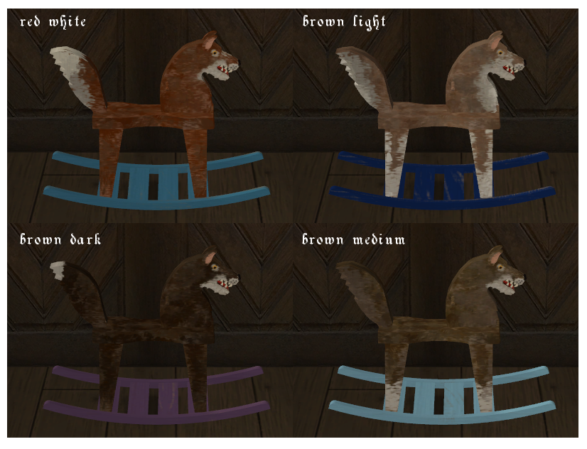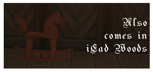 First I made some wood grain and shading to give a carved wooden look and filtered it over the iCad woods for a solid-tone stained wood look. The reins are various shades of neutrals.
