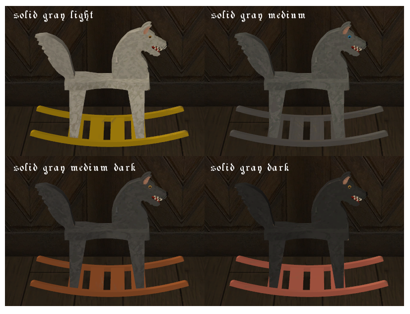 The four shades of solid gray: light, two mediums- one darker than the other- and a dark gray. I also made one of the recolors with blue eyes in honor of Blind Seer from Jane Linkskold's series about Firekeeper.