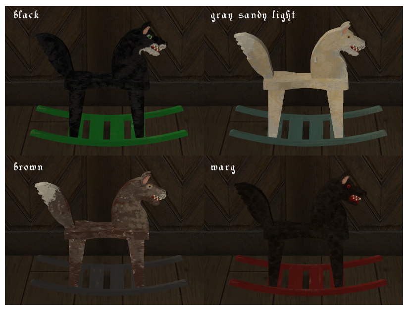 And the last batch- a black with green eyes (for the baby), a creamy yellow, another brown that I personally dubbed the coyote-ugly, and last of all, my favorite: the Warg. With blood-stained teeth and bright red eyes, this is the rocking toy of Mordor!